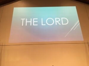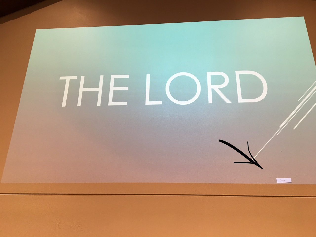 [Note: On the front wall of the auditorium is a projection about five feet by 8 feet with the words THE LORD displayed].